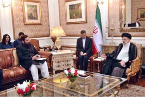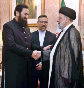 LAHORE: April 23 – Muhammad Balighur Rahman Governor of Punjab shaking hand with President of the Islamic Republic of Iran Dr. Seyyed Ebrahim Raisi at Governor House.
