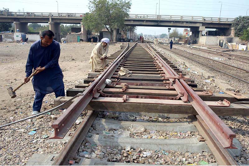 Railway workers are busy working the Kanta line track to divert trains from one track to another.