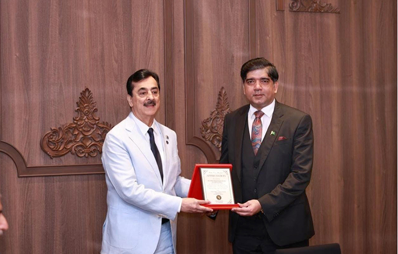 Renowned businessman and investor Chaudhry Usman Nasir presents a shield to Syed Yousaf Raza Gilani on behalf of the Chairman of Panjtan Group after his address to the business community.