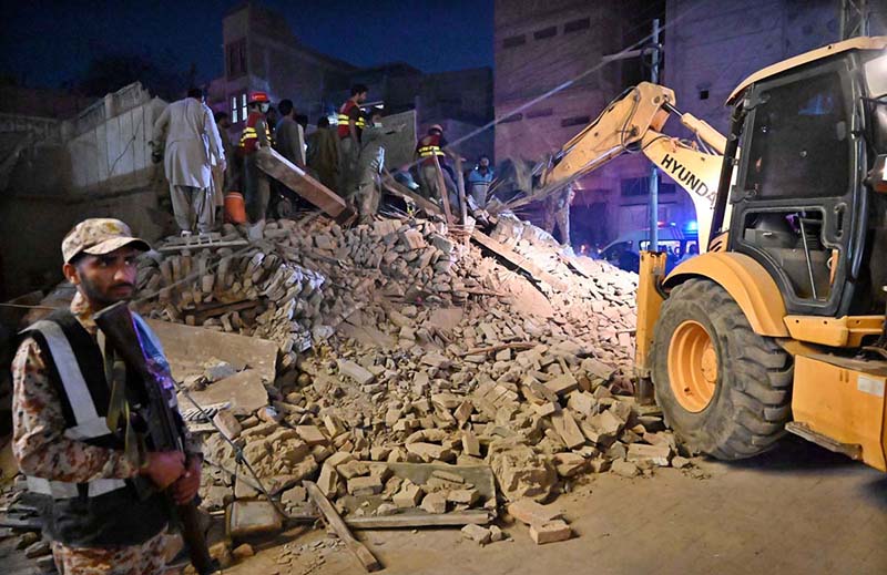LARKANA: March 12 – Rescue workers busy in rescue operation to pull out the owner of the house Teacher Naeemullah Baloch, who is trapped in the rubble after house collapsed in Sheikh Mohalla of Larkana city on late Tuesday Night. APP/NAS/MAF/TZD