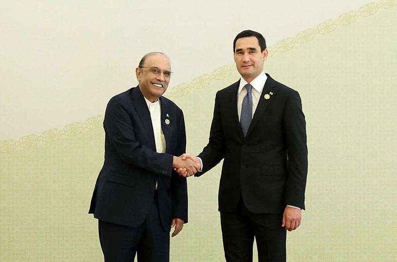 resident Asif Ali Zardari being welcomed by the President of Turkmenistan, Serdar Berdimuhammadov, upon his arrival at the International Forum on “Interrelation of Times and Civilizations – Basis of Peace and Development.