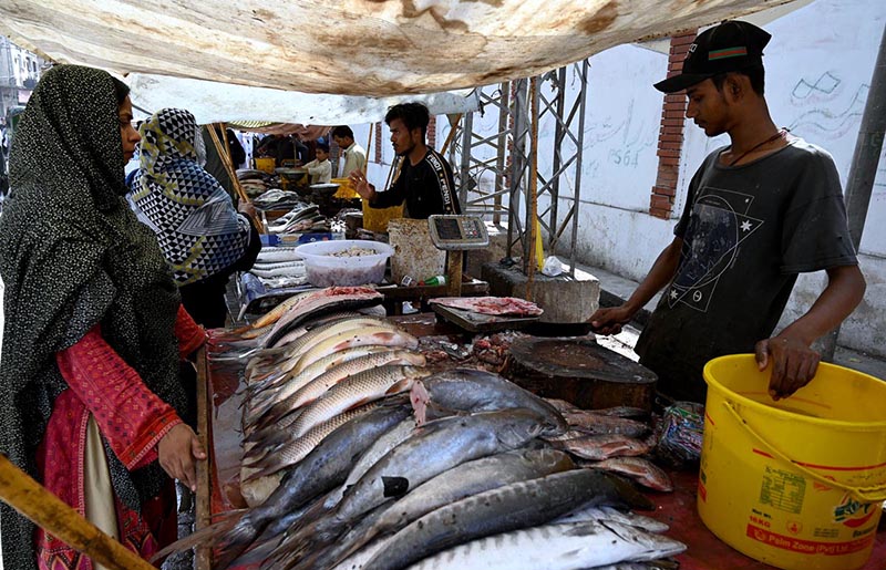 Roadside vendor displaying fishes to attract the customers at Faqir ka pir road
