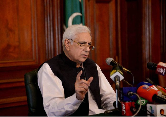 SAPM on Accountability Irfan Qadir addressing a Press Conference at Governor House