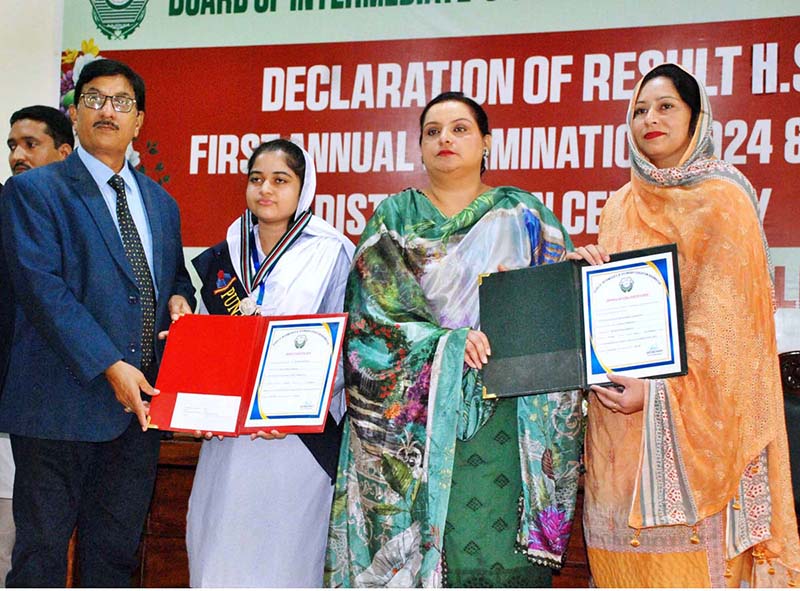 BAHAWALPUR: September 04- Secretary Education Board Zahoor Ahmed Chauhan and Controller of Examinations Asma Qasim giving certificates of appreciation to the best performing students and teachers during the grand function of the Intermediate Annual Examinations 2024.