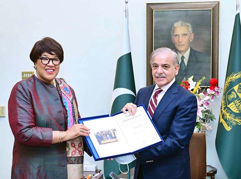 Secretary General of the, Commonwealth H.E. Ms Patricia Scotland, presenting Charter of the Commonwealth to Prime Minister Muhammad Shehbaz Sharif.