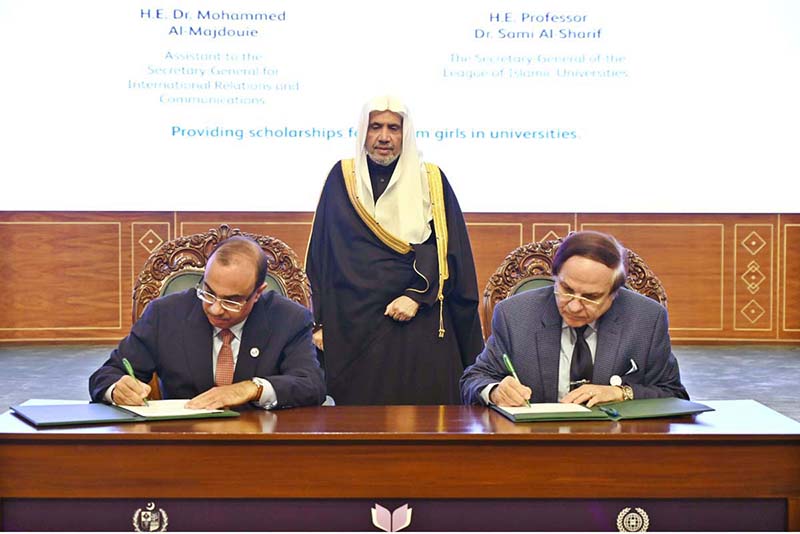 Secretary General of the Muslim World League, Sheikh Dr. Mohammed bin Abdulkarim al-Issa, witnesses Signing of International Partnership Agreements between Dr. Mohammed Al-Majdouie Assistant to the Secretary General for International Relations and Communications with Secretary General of the League of Islamic Universities-Egypt, Prof Sami Mohammad Rabie Al-Sharif during Closing ceremony of the International Conference Girls Education at Jinnah convention Centre