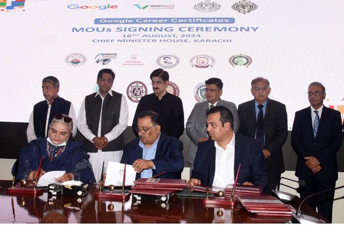 KARACHI: August 16 - Secretary U&B Noor Ahmad Samoo, CEO Tech Valley Umar Farooq, and the vice-chancellor of the public sector university sign an MOU for allocating 1000 scholarships in Google Career Certificates. Sindh Chief Minister Syed Murad Ali Shah, Chief Secretary Asif Hyder Shah, Chairman HEC Prof. Tariq Rafi, and others witnessed the ceremony at CM House. APP/MAF/FHA