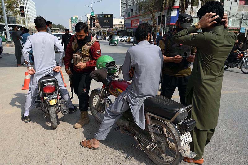 PESHAWAR: February 27 – Security personnel conduct security checks of motorcyclists and verify