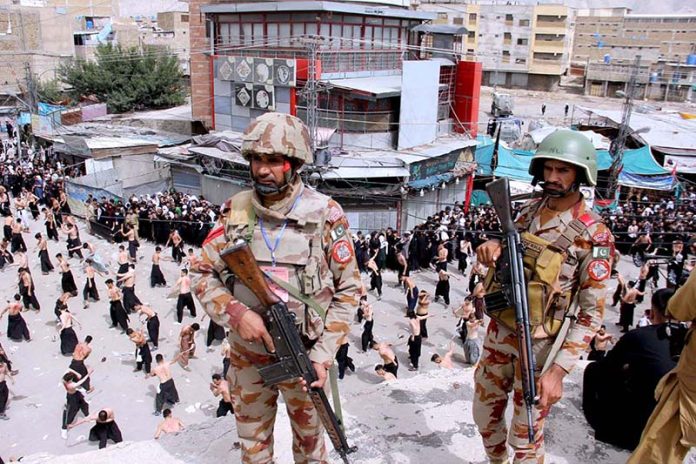 QUETTA: July 29 – Security personnel high alert during the main procession of 10th Muharram-ul-Haram. Ashoura is the commemoration marking the Shahadat (death) of Hussein (AS), the grandson of the Prophet Muhammad (PBUH), with his family members during the battle of Karbala for the upright of Islam. APP/MNN/ABB