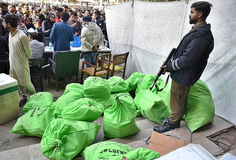 LAHORE: February 07 – Security personnel on duty during distribution of election materials, at Anar Kali Revenue Board office for upcoming General Election February 08, 2024. APP/AMI/MAF/TZD/ABB