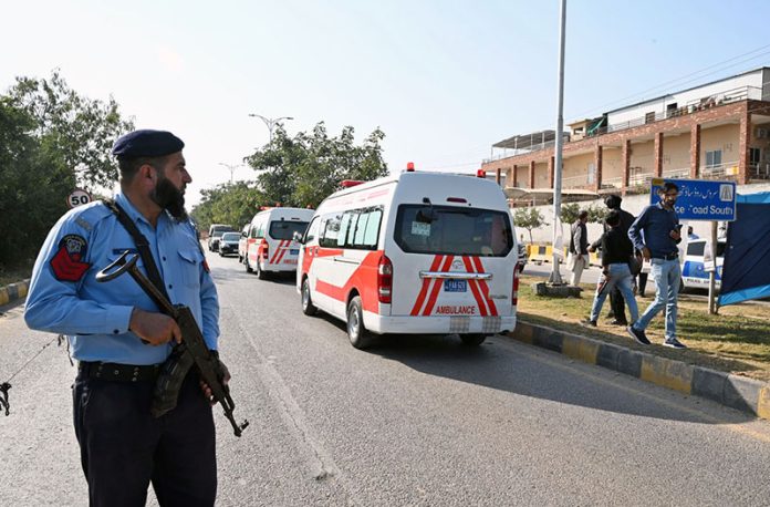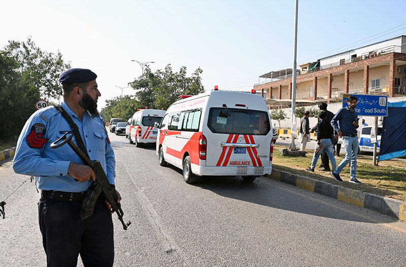ISLAMABAD: November 11 – Security personnel remain on high alert and have cordoned off the District Judicial Complex following a terrorist blast that, according to initial reports, left twelve people dead and twenty others injured. APP/SAK/MAF/TZD/ABB