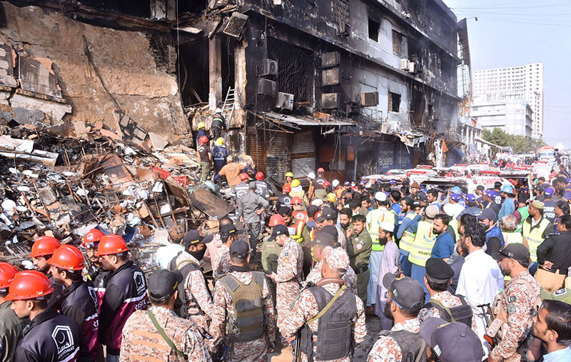 KARACHI: January 19 Aggrieved relatives of people who went missing in the Gul Plaza fire look toward the wreckage in the hope of the return of their loved ones. APP/SDQ/IQJ/TZD/FHA