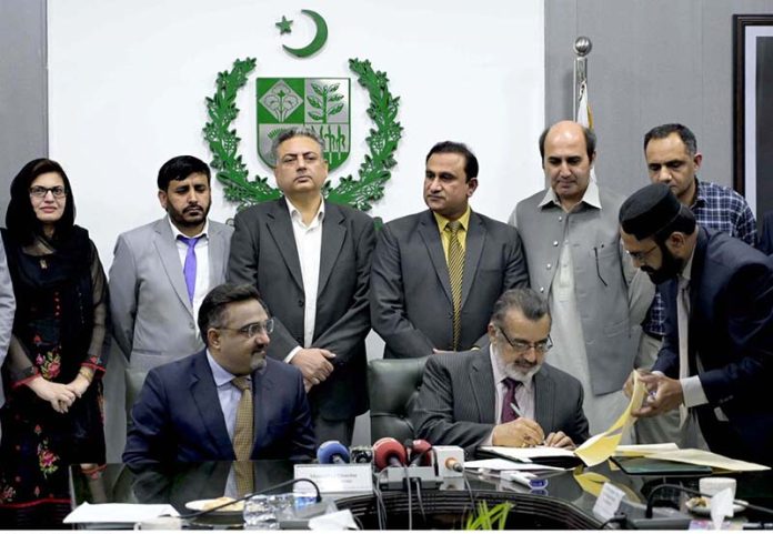 ISLAMABAD: October 07 - Senator Capt. (R) Shaheen Khalid Butt, Managing Director Pakistan Bait-ul-Mal (PBM), and Executive Director NAVTTC, Muhammad Aamir Jan, sign a Memorandum of Understanding (MoU) between Pakistan Bait-ul-Mal and the National Vocational and Technical Training Commission (NAVTTC) for the accreditation of Women Empowerment Centres (WECs) of PBM, aimed at strengthening vocational training and promoting women’s economic empowerment. APP/IFD/FHA