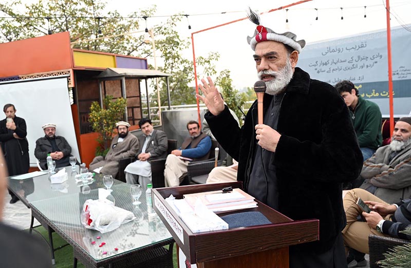 Senator Talha Mahmood addresses a ceremony for the book launch of Qazi Inayat Jalil Anbar, a prominent Khowar literature writer, poet, and radio host, on the publication of his new book “Sada Bahar Khowar Geet” (Volume I)