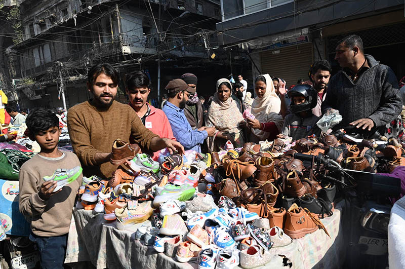 LAHOREShoppers browse and purchase shoes from a hand-carried vendor on a holiday in the city