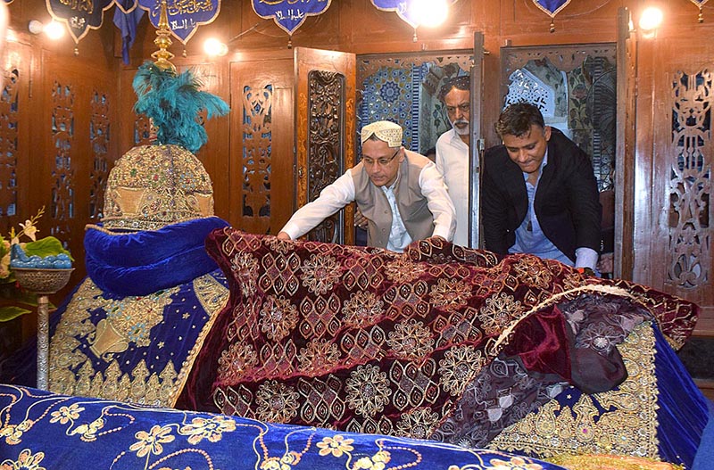 BHITSHAH: September 01 – Sindh Caretaker Minister for Culture and Tourism Syed Dr. Junaid Shah and Sindh Caretaker Minister for Religious Affairs Muhammad Umar Soomro leaving wreath on the grave of Hazrat Shah Abdul Latif Bhitai on the occasion of 280th Urs celebration. APP/AKS/MAF/ZID