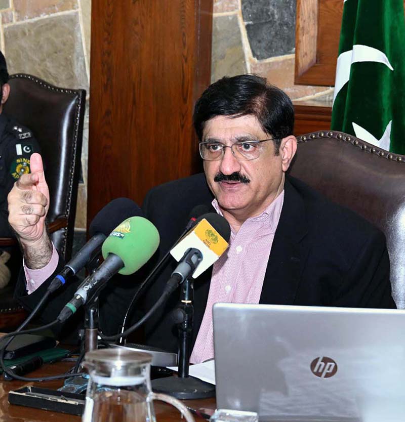 Sindh Chief Minister Syed Murad Ali Shah addresses a press conference at the CM House to launch a digital registration system for a targeted motorcycle fuel subsidy programme.