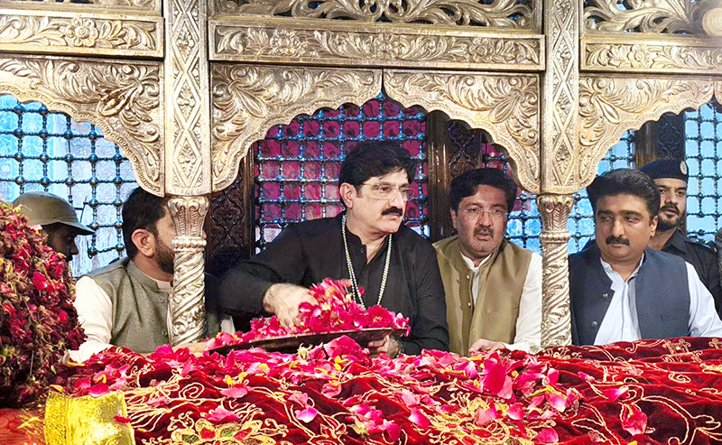 Sindh Chief Minister Syed Murad Ali Shah putting flower petals after laying wreath on the grave of Hazrat Lal Shahbaz Qalandar on the last day occasion of 774th Urs celebration