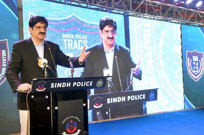 Sindh Chief Minister Syed Murad Ali Shah speaks at the inauguration ceremony of the Traffic Regulation and Citation System (TRACS) at the Central Police Office.
