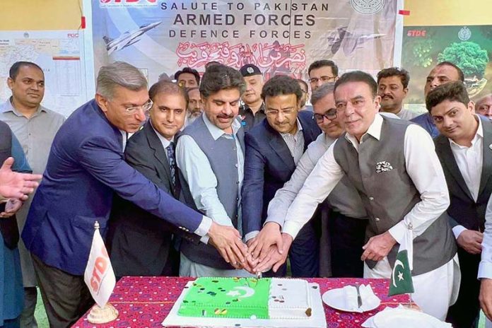 Sindh’s Minister for Energy and Planning, Syed Nasir Hussain Shah, along with Sindh’s Interior Minister Zia Lanjar cutting cake during paid tribute ceremony to the commanders and soldiers of the Pakistan Armed Forces for the success of Operation Bunyan Mursas against Indian aggression