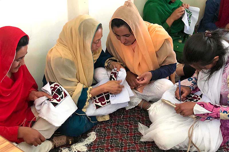 GILGIT: October 01 – Skilled women are embroidering bed sheets and pillows for sale at the Women’s Market. APP/AHS/TZD/ZID
