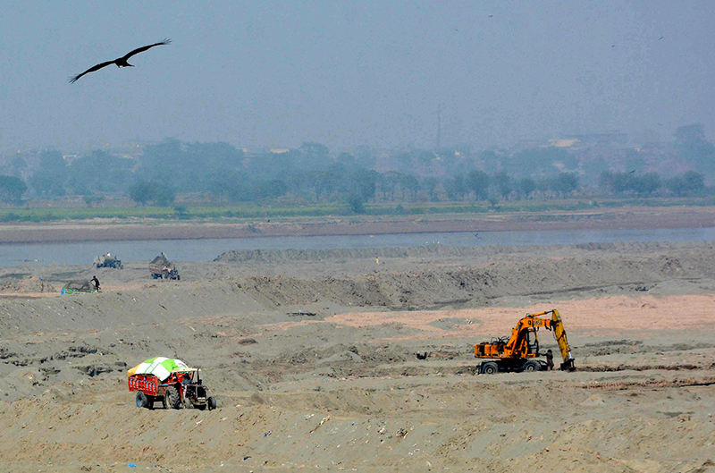 Soil is being removed with the help of a crane after the flood in the Ravi River.