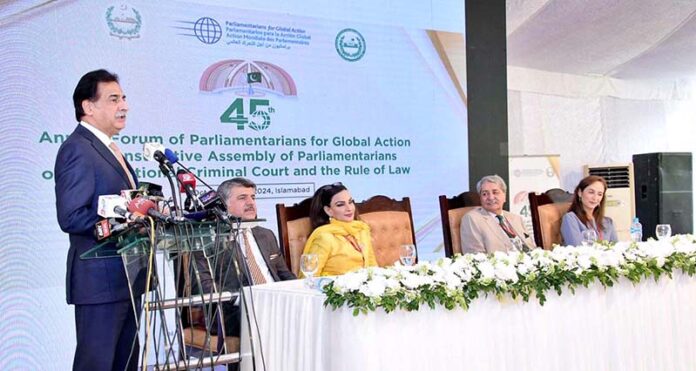 Speaker National Assembly Sardar Ayaz Sadiq addressing the Inaugural Session of the 45th Annual Forum of the Parliamentarians for Global Action (PGA) and the 13th Consultative Assembly of Parliamentarians on the International Criminal Court (CAP-ICC) and the Rule of Law.