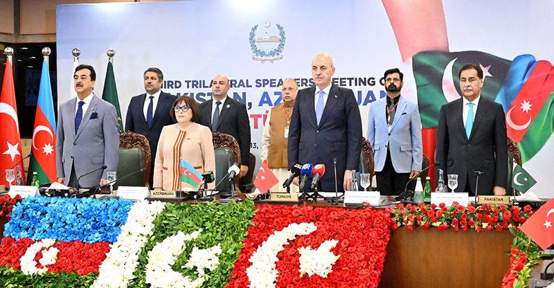 ISLAMABAD: October 13 - Speaker National Assembly Sardar Ayaz Sadiq along with Speaker of the Grand National Assembly of Turkiye Numan Kurtulmus, Speaker of the Milli Majlis of Azerbaijan Ms. Sahiba Gafarova and Chairman Senate of Pakistan Syed Yousaf Raza Gillani listening to the National Anthem on the occasion of Inaugural Session of the Third Trilateral Speakers Meeting of Azerbaijan, Pakistan and Turkiye at Parliament House. APP/MAF/TZD