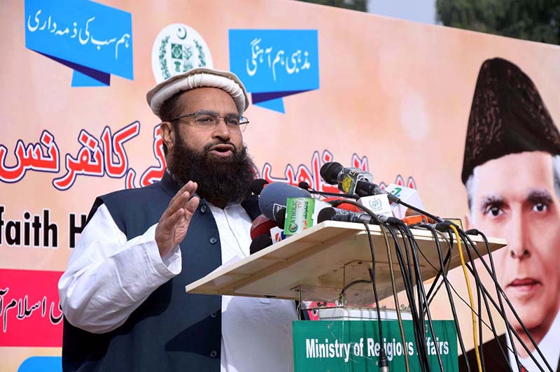 Special Assistant to Prime Minister on Interfaith Harmony Maulana Tahir Ashrafi addressing a conference about Interfaith Harmony at Huzuri Bagh Badshahi Masjid