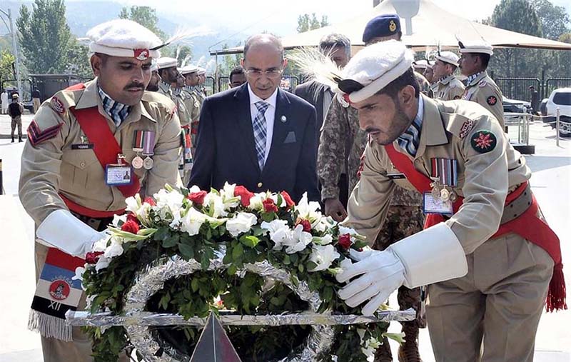 MUZAFFARABAD: October 13 – Special Envoy of Organization of Islamic Cooperation (OIC) Secretary General for Jammu & Kashmir, His Excellency Ambassador Yousef Muhammed Saleh Aldobey laid floral wreath at J&K Monument during his visit to Chakothi (LOC) and Muzaffarabad along with High level delegation from brotherly Muslim countries including KSA and Sudan. APP/ABB