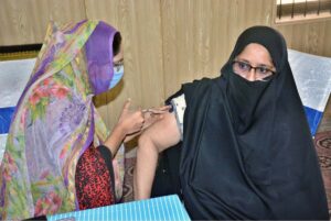 Staffers are administering preventive vaccination to the pilgrims at the Haji Camp Cooperative Training College.