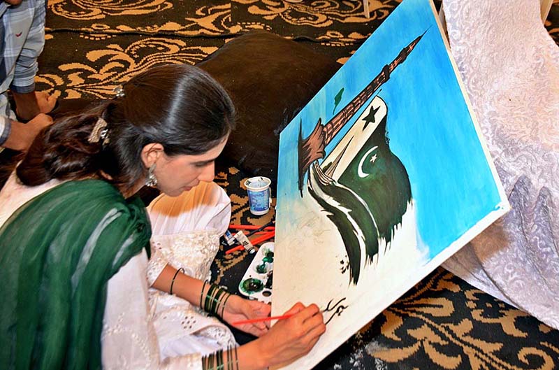 LAHORE: August 13 – Student giving Final touches to her painting during Independence Day Painting Competition. APP/AHF/ZID