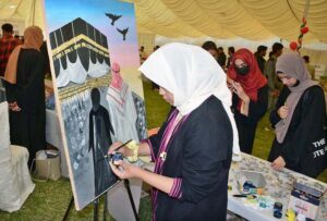Student is giving final touches to her painting during All Pakistan Business Startup Expo of 10th Lyallpur Arts & Literature Festival at University of Agriculture Faisalabad (UAF).