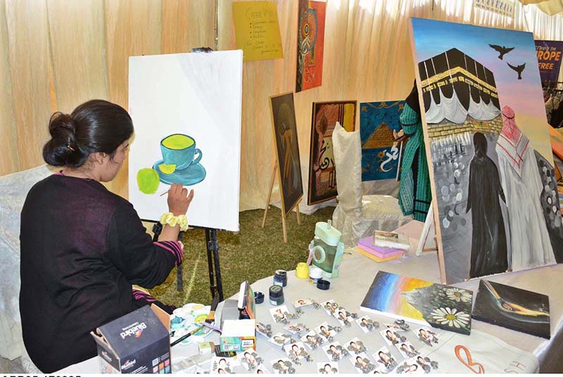 FAISALABAD: February 17 – Student is giving final touches to her painting during All Pakistan Business Startup Expo of 10th Lyallpur Arts & Literature Festival at University of Agriculture Faisalabad (UAF). APP/TWR/MAF/TZD/FHA