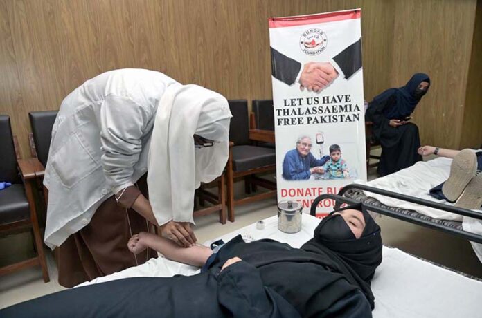 SARGODHA: February 11 – Students are donating blood in Blood Donation Camp for Thalassemia patients organized by Give Life Foundation, Noon Business School and Sundas Foundation at University of Sargodha. APP/HSD/TZD