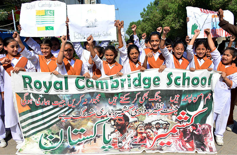Students are participating in a rally to show solidarity with Kashmiri people on 27 October marks as Black Day to condemn the Indian atrocities against Kashmiris and illegal occupation at Latifabad