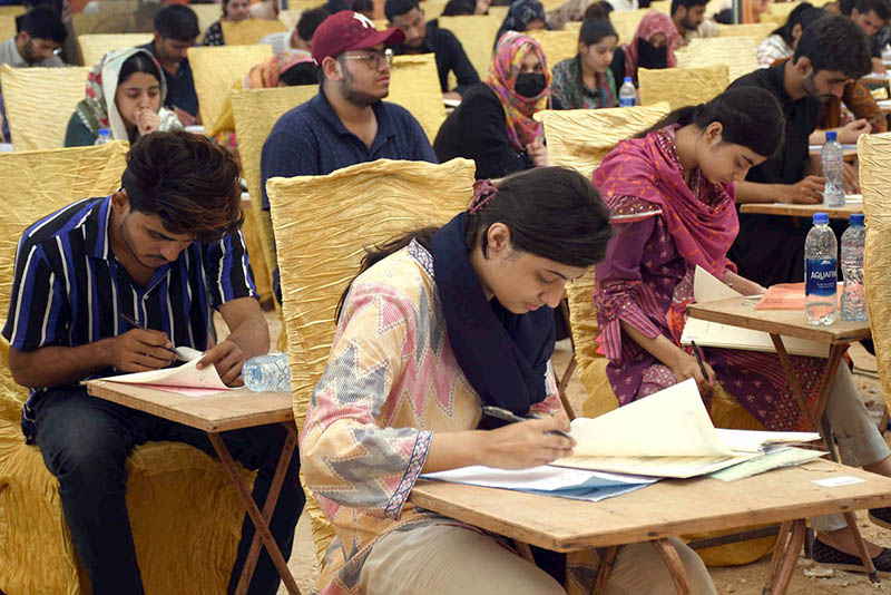 Students are solving their question papers during Pre entry test for admission in the Liaquat University of Medical & Health Sciences (LUMHS) at Jamshoro