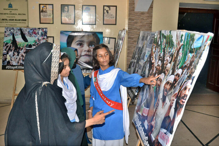 MULTAN: August 05 – Students are viewing pictures during an exhibition to mark the Youm-e-Istehsal Kashmir (Exploitation Day) organized by the Arts Council.