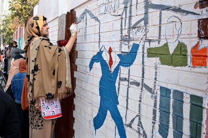 Students of Government graduate college for Women participating in wall painting competition during international anti-corruption day organized by the National accountability Bureau (NAB).