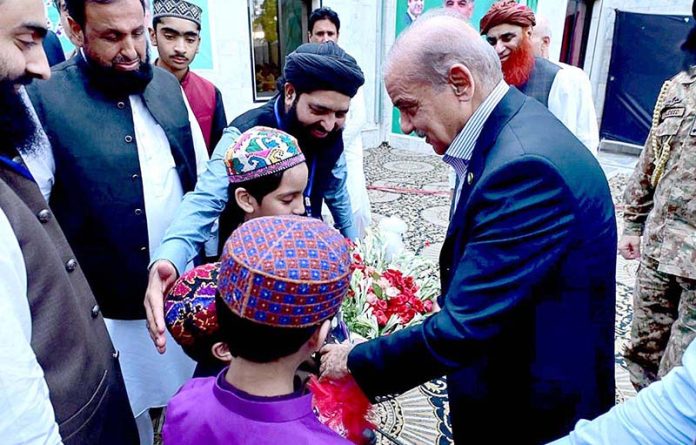 Students of Idara Talemat-e-Islamia presenting flower bouquets to Prime Minister Muhammad Shehbaz Sharif upon his arrival