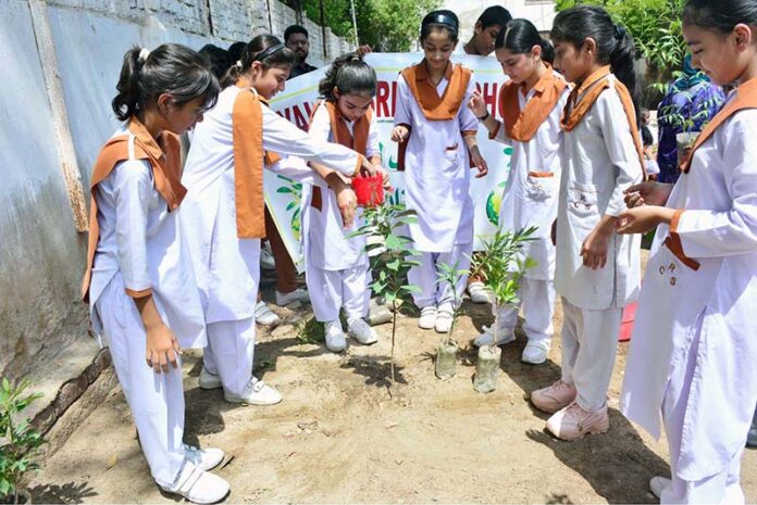 Students of school are showering water on the plant saplings during a plantation campaign at the Government anti-TB Hospital area in Latifabad