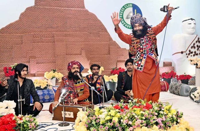 Sufi singers Wahid Bukhsh and Sain Sajid Ali perform at a function held at the Press Club.