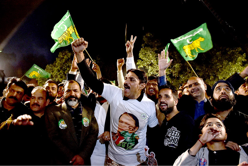 LAHORE:February 09- Supporters of Former Prime Minister Nawaz Sharif's party 'Pakistan Muslim League-N' dance to celebrate their party victory at Model Town.APP Photo by MTF