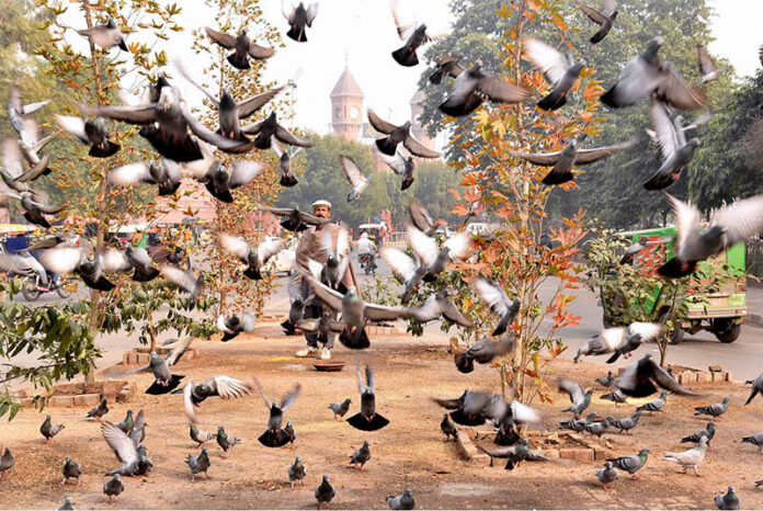 The peaceful flight of a flock of pigeons at the railway station adds a mesmerizing scene to the atmosphere of Lahore