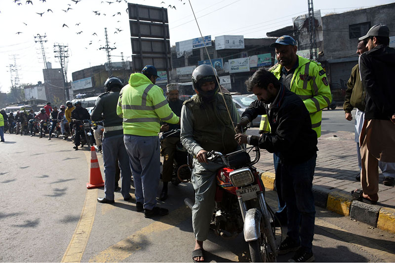 Traffic police begin installing free safety rods on motorcycles ahead of the Basant festival in the Provicial Capital
