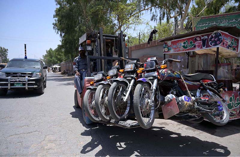 Traffic police’s official lifting illegal parked motorbikes with the help of lifter at City Road