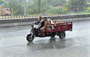 ISLAMABAD: August 29 – A tri-cycle loader on the way at IJP Road during heavy rain in Federal Capital.