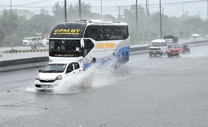 ISLAMABAD: August 29 – Vehicles passing through rainwater accumulated at IJP Road during heavy rain in Federal Capital.