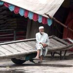 SARGODHA: August 28 – A motorcyclist passing through rainwater accumulated in the street under the cover of an umbrella to protect from rain.