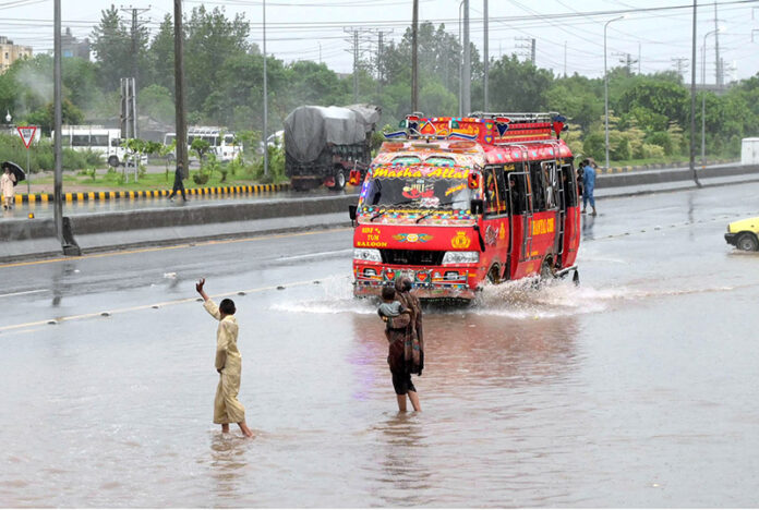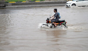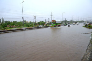Vehicles passing through the stagnant water at IJP Road during heavy rain in Federal Capital